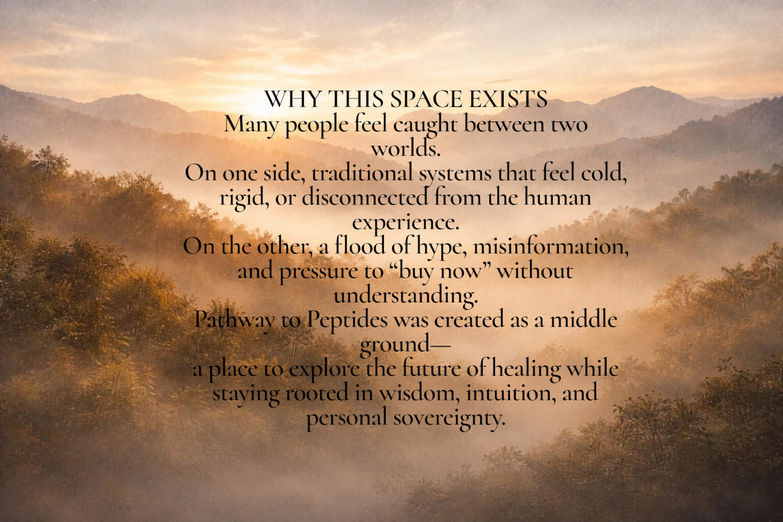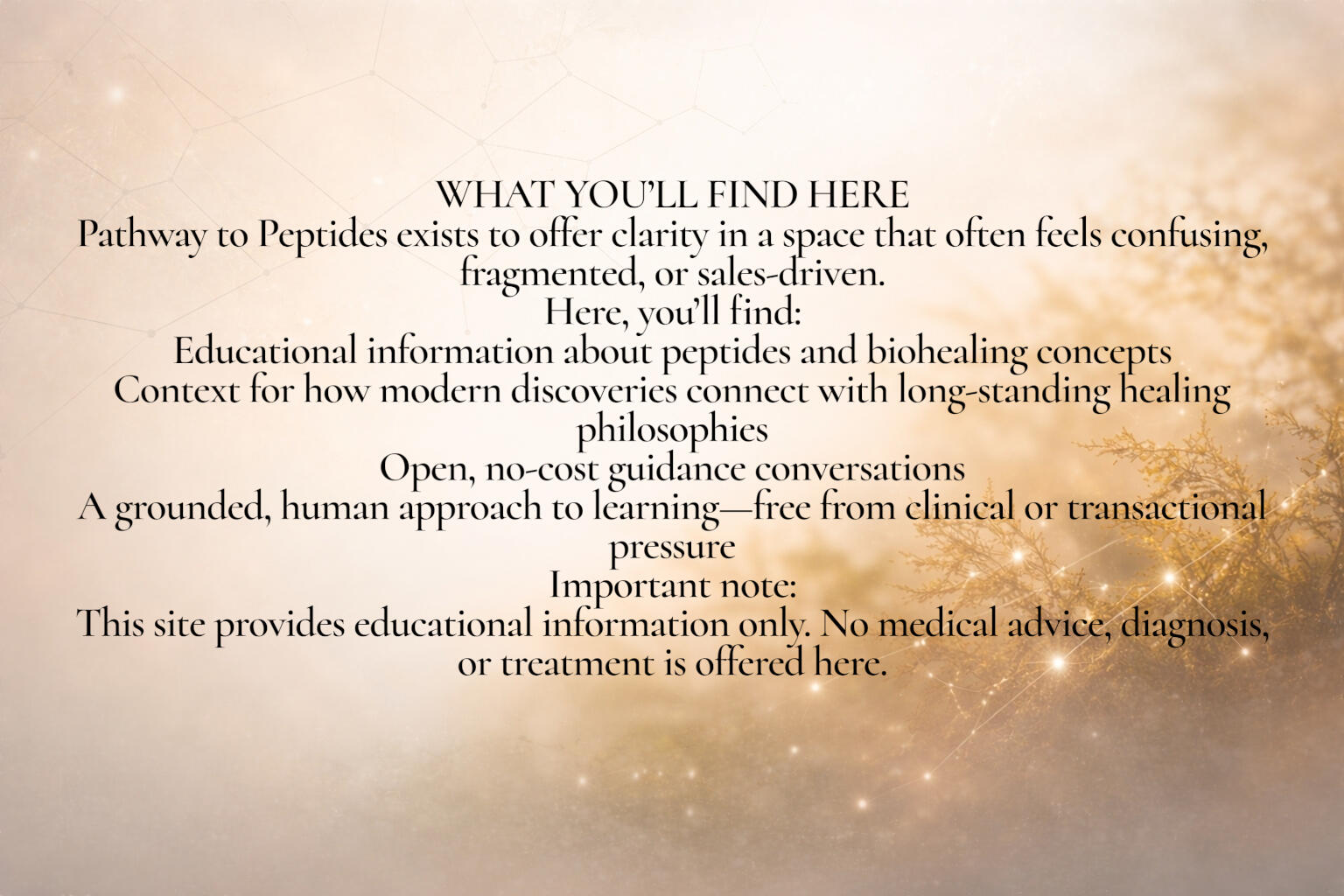 WHAT YOU’LL FIND HEREPathway to Peptides exists to offer clarity in a space that often feels confusing, fragmented, or sales-driven.Here, you’ll find:Educational information about peptides and biohealing conceptsContext for how modern discoveries connect with long-standing healing philosophiesOpen, no-cost guidance conversationsA grounded, human approach to learning—free from clinical or transactional pressureImportant note: